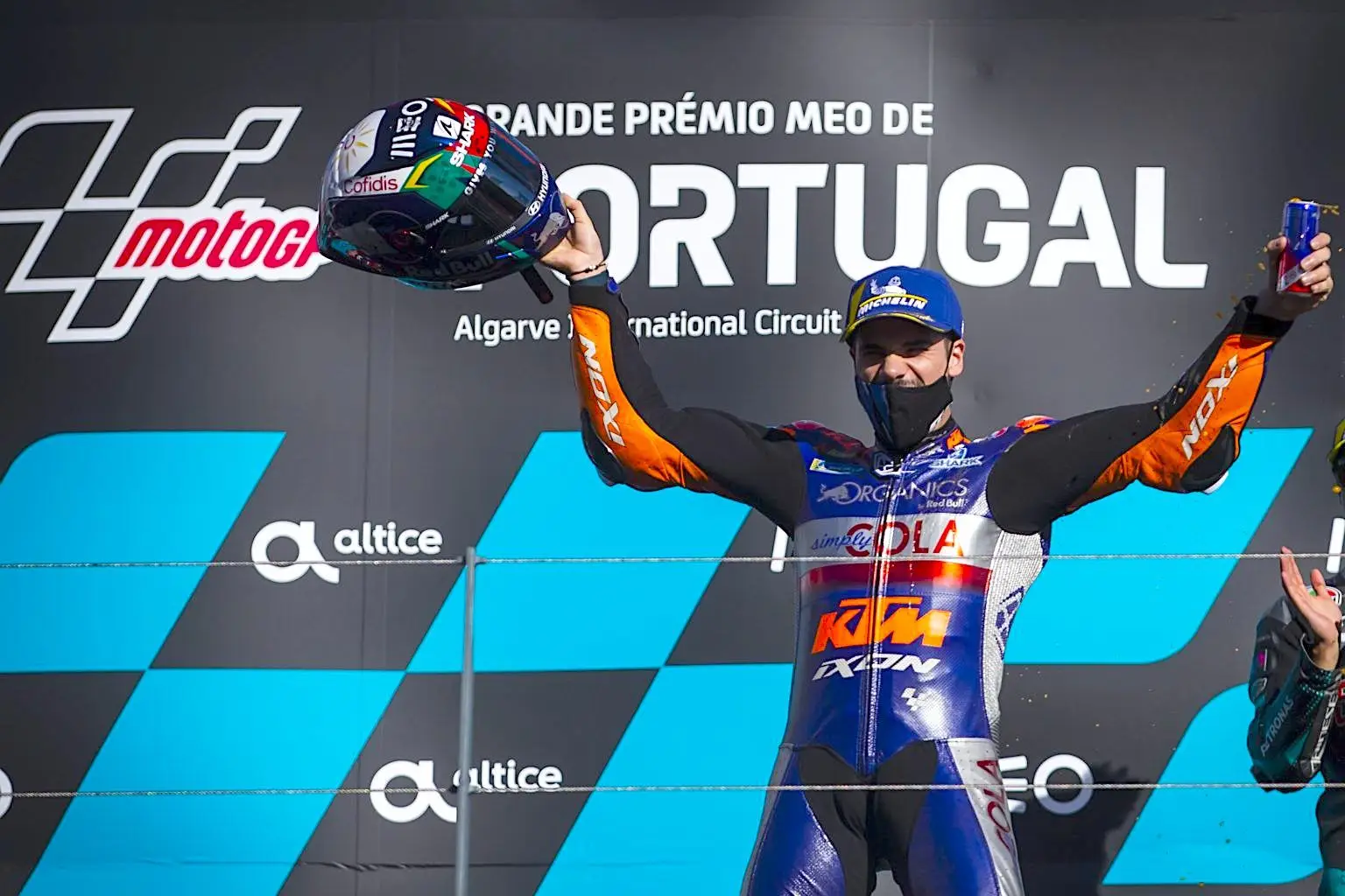 É difícil passar para palavras o que sinto. O piloto português saiu de quarto, rapidamente atacou os primeiros postos e dali em diante, tirando uma curta troca com quartararo, não mais largou a liderança. Dedico a vitória a todos os adeptos que estão aqui, esta semana tem sido fantástica, é bem ver que as coisas estão a voltar à normalidade. Miguel oliveira foi o mais rápido no grande prémio de portugal de motogp no autódromo internacional do algarve, em portimão. O dia poderia ser de festa, pois miguel oliveira conseguiu a prata no grande prémio de itália de motogp, mas a corrida.